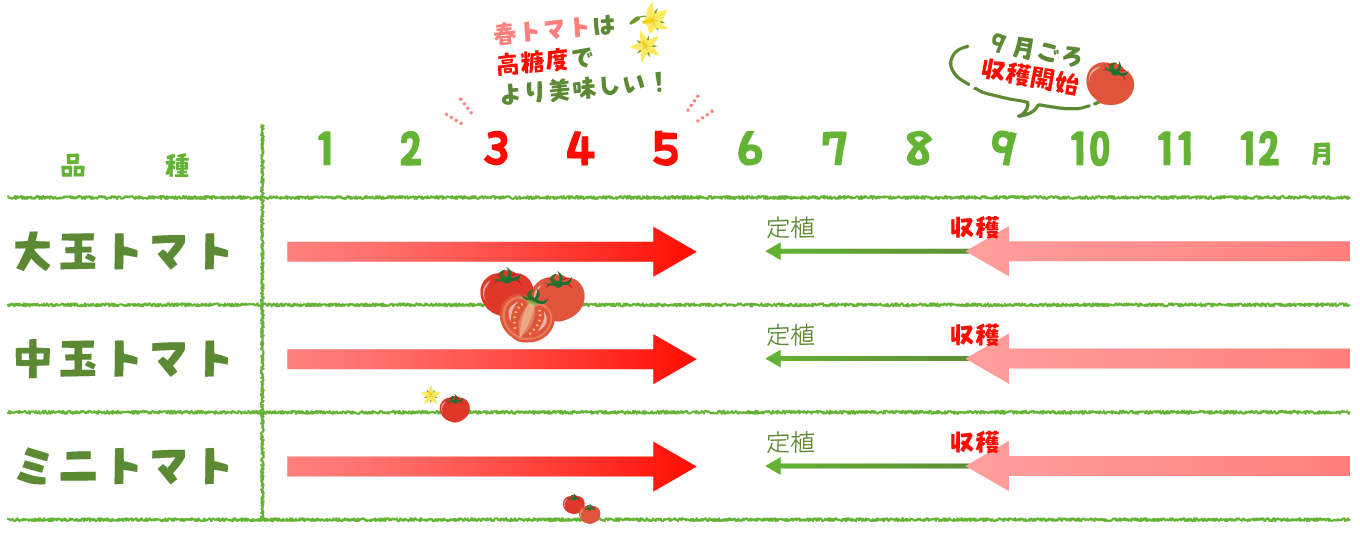 ふっくらとした丸みで食卓に馴染みのある品種です。初冬~初夏にかけて甘味が増し、糖度は10度を超えるものも出てきます。しっかりとした甘味と適度な酸味でバランスが良く、さらにうま味も強く濃厚な食べ応えです。トマトが好きな方はもちろんのこと、トマトが苦手な方にもオススメです。